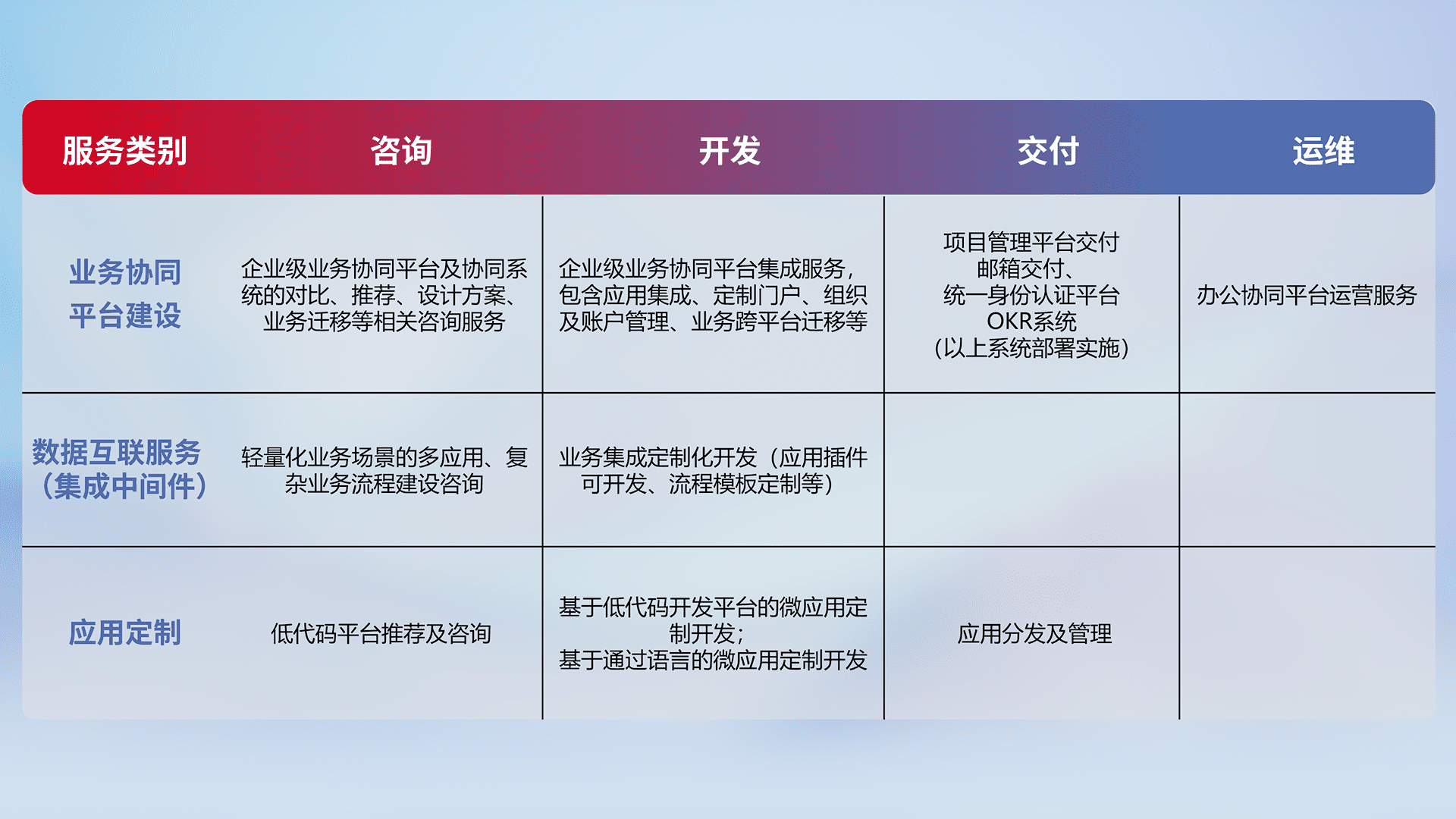 针对钉钉、、、、企微、、、IDaas等平台级产品提供产品的规划、、、方案、、交付、、、定制化开发等服务,,,实现如统一协同办公、、、智能客户服务、、混合会议管理、、、智能数据查询、、、、等业务场景,,,,实现数字化转型。。。。