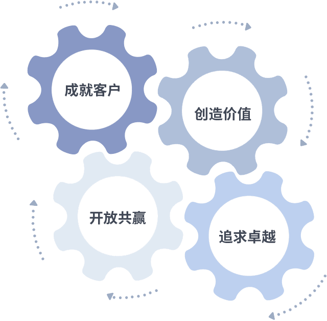 成就客户是一切决策的出发点,,创造价值是衡量所有工作的标准,,追求卓越是我们做事做人的态度,,开放共赢是我们的格局也是最终的结果。。。价值观的齿轮环环相扣,,,推动着组织里的每个人不断向前。。。